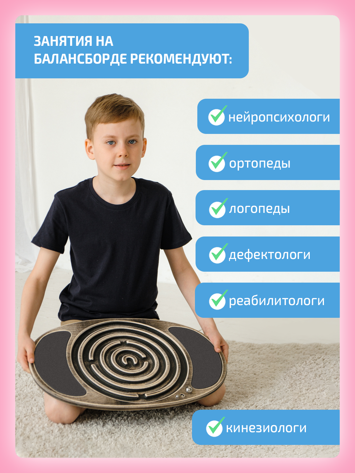 Это помощник для тренировки баланса, улучшения сенсорной интеграции и развлечение, которое понравится детям и взрослым. Как и другие нейротренажеры, например, доска Бильгоу, баланс борд широко используется для данной методики, дополнительно он оснащен игровой консолью в виде лабиринта. Балансировочная доска и ее опоры выполнены из натурального дерева. Все детали тщательно обработаны и покрыты полностью безопасным экологичным составом. Для устойчивости ног нейротренажер имеет противоскользящие вставки. Доска балансир выдерживает вес до 150 кг. 3 металлических шарика разного диаметра надежно держатся на магнитных креплениях доски. С помощью сумки, которая уже есть в комплекте, удобно хранить и перемещать тренажер, а специальный противоскользящий коврик поможет сделать занятия безопаснее и не повредить пол. Ребенок может использовать баланс борд c лабиринтом по-разному: использовать доску только как балансир: удерживать равновесие, задействуя мышцы пресса, ног, грудные, ягодицы и мышцы-стабилизаторы; стоять на доске и одновременно управлять шариком в лабиринте при помощи баланса тела; взять лабиринт в руки и двигать шарик балансом движения рук или пальцами. И все занятия и игры с тренажером принесут пользу и помогут: улучшить крупную моторику; развить логическое мышление; стимулировать концентрацию внимания; работать с улучшением навыка чтения и письма; улучшить работу вестибулярного аппарата и ориентацию в пространстве; развить координацию; быстрее освоить виды спорта, в которых требуется равновесие — езда на роликовых коньках, велосипеде, лыжах или сноуборде; интересно провести время. Балансир универсален: подойдет для применения дома, в центре развития детей и в дошкольном учреждении, а также будет полезен взрослым.