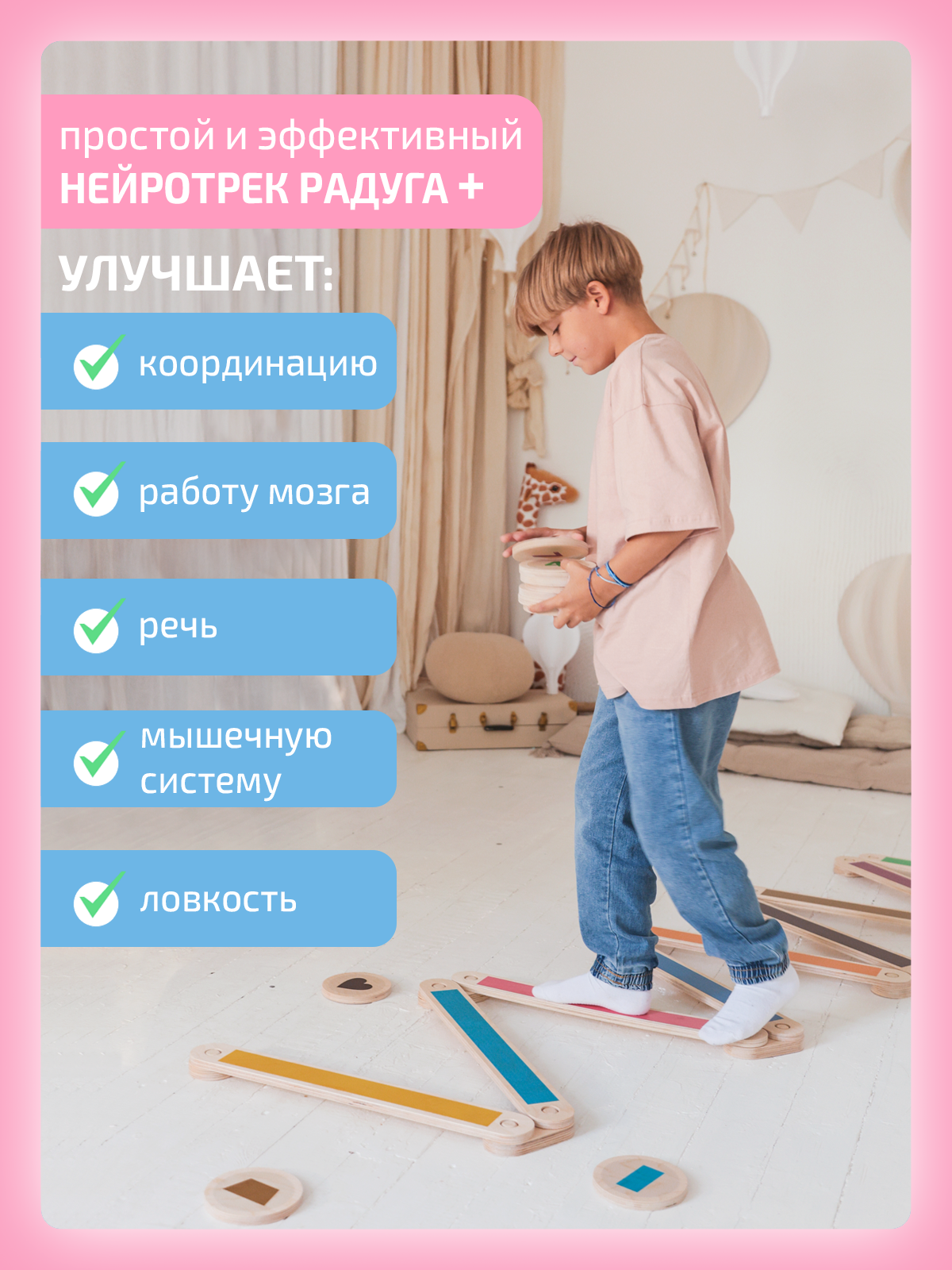 Нейротрек – это доска балансир, разработанный по методикам Марии Монтессори и Эммы Пиклер. Он тренирует координацию, ловкость, чувство баланса и равновесия, а также способствует всестороннему развитию интеллекта посредством физических упражнений и изучения цветов, цифр и геометрических фигур.
