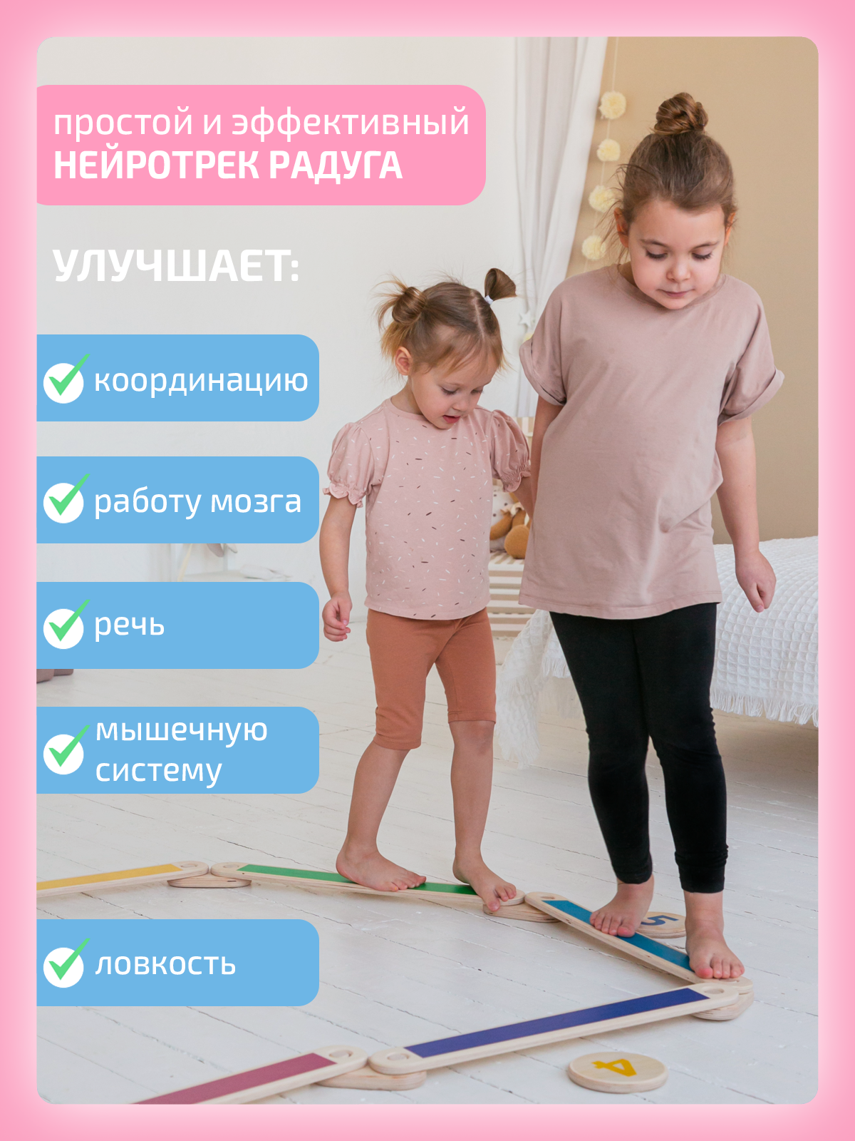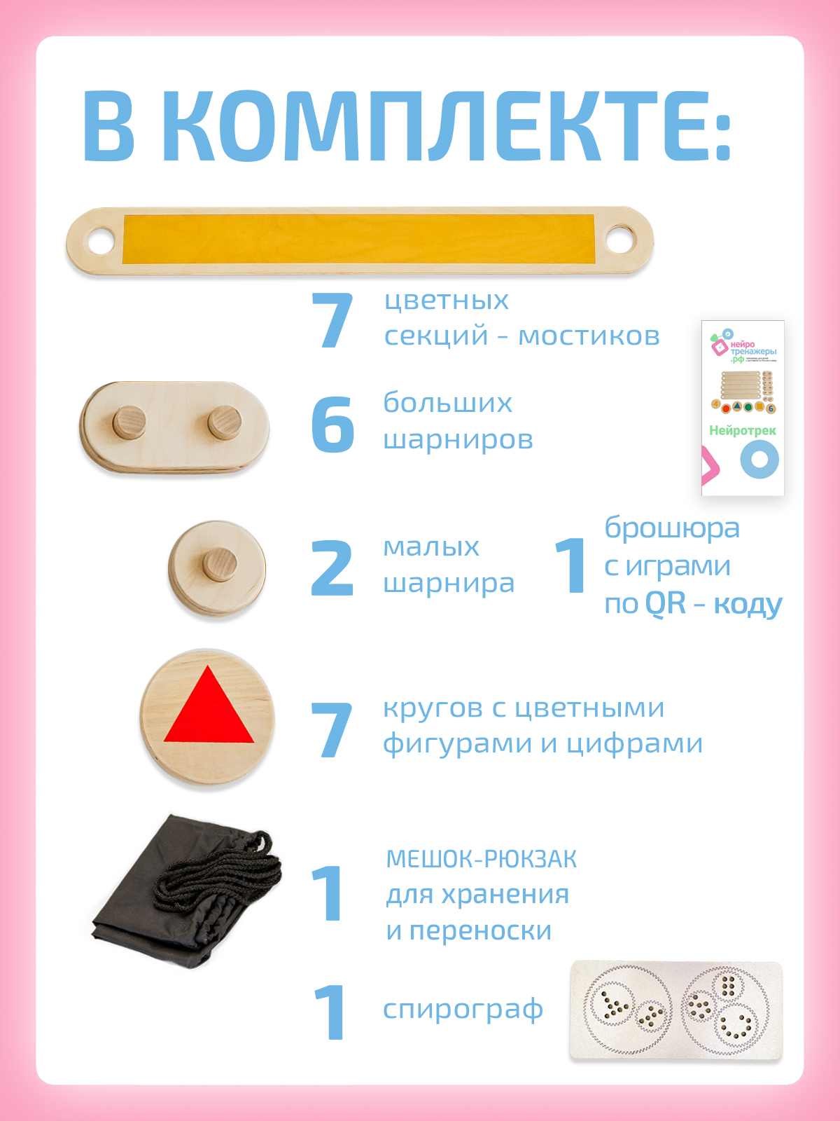 Нейротрек – это доска балансир, разработанный по методикам Марии Монтессори и Эммы Пиклер. Он тренирует координацию, ловкость, чувство баланса и равновесия, а также способствует всестороннему развитию интеллекта посредством физических упражнений и изучения цветов, цифр и геометрических фигур.